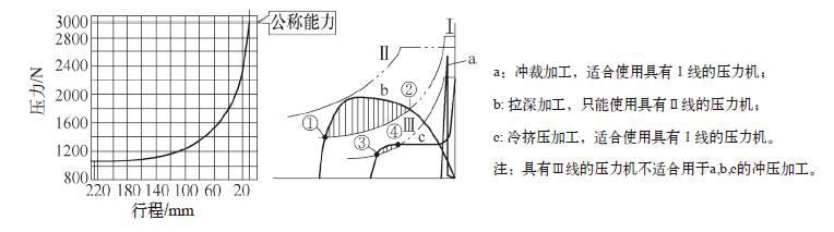 圖為行程壓力曲線,顯示壓力機的行程長度和公稱能力發(fā)生位置、滑塊的下死點上位置和壓力機能夠產(chǎn)生的加壓力之間的相互關系。從曲線圖上可以看出最大加壓力就是公稱能力,公稱能力發(fā)生的位置就是公稱能力發(fā)生點。從公稱力發(fā)生點到下死點之間可以達到公稱能力,從能力發(fā)生點開始越向上,離下死點的距離越大能夠發(fā)生的加壓力越小。